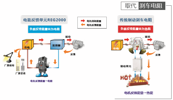 取代傳統動態煞車電阻裝置。一般傳統交流變頻器驅動馬達在運動瞬間或頻繁煞車時,利用安裝高瓦數的煞車電阻來吸收過多的反饋能量,并轉成熱能散發。解決負載能量反饋但效率不佳,且增加硬件額外費用與空間。使用AFE2000系列之后,負載反饋的能量不需要再轉換成熱能散發掉,相對的可以將反饋能量回饋到電網,省電省錢而且環保,如下圖所示。